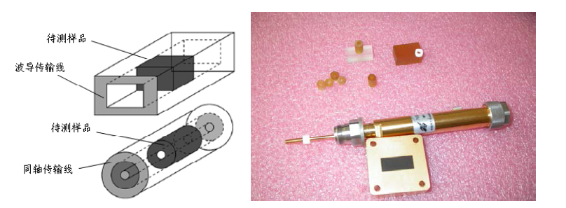 介質材料傳輸線測試法根據(jù)不同的波段將測試夾具做到系列化,以滿足寬頻帶的測試要求。同軸測試夾具的連接器采用國際標準連接器,波導測試夾具采用標準波導和標準法蘭。測試夾具及待測樣品示意如圖所示。