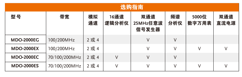 MDO-2000EG具有內(nèi)置頻譜分析儀和雙通道25MHz任意波發(fā)生器;MDO-2000EX具有內(nèi)置頻譜分析儀、雙通道25MHz任意波發(fā)生器、5000位數(shù)字萬用表和雙通道5V/1A電源;MDO-2000EC具有內(nèi)置邏輯分析儀、頻譜分析儀和雙通道25MHz任意波發(fā)生器;MDO-2000ES 具有內(nèi)置邏輯分析儀、頻譜分析儀、雙通道25MHz任意波發(fā)生器、5000位數(shù)字萬用表和雙通道5V/1A電源“六合一”機(jī)種全功能示波器
